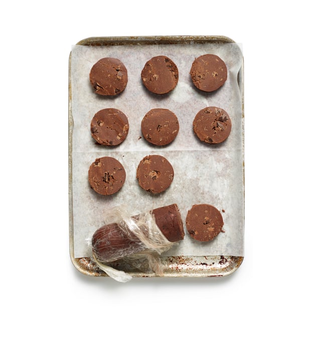Μετά από 2 ώρες ή και περισσότερο (πρέπει η ζύμη να παγώσει καλά) ζεσταίνετε το φούρνο στους 180 C στις αντιστάσεις. Στρώνετε λαδόκολλα στη λαμαρίνα, για να ψήσετε τα σοκολατένια μπισκότα.