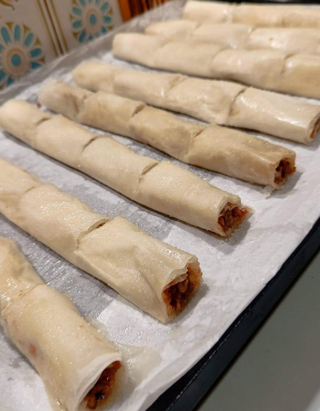 Βάζουμε γέμιση κατά μήκος της άκρης των δύο φύλλων και τα τυλίγουμε σε μπαστουνάκι (ρολό).