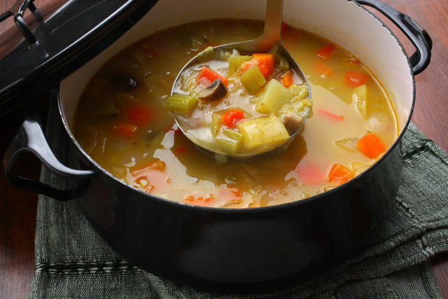 4. Προσθέστε το ζωμό, τις πατάτες και τα λαχανικά αυτα που γίνονται γρηγορότερα (όπως τα σπαράγγια και τα μπιζέλια). Αφήστε τη σούπα να έρθει σε βράση, στη συνέχεια,