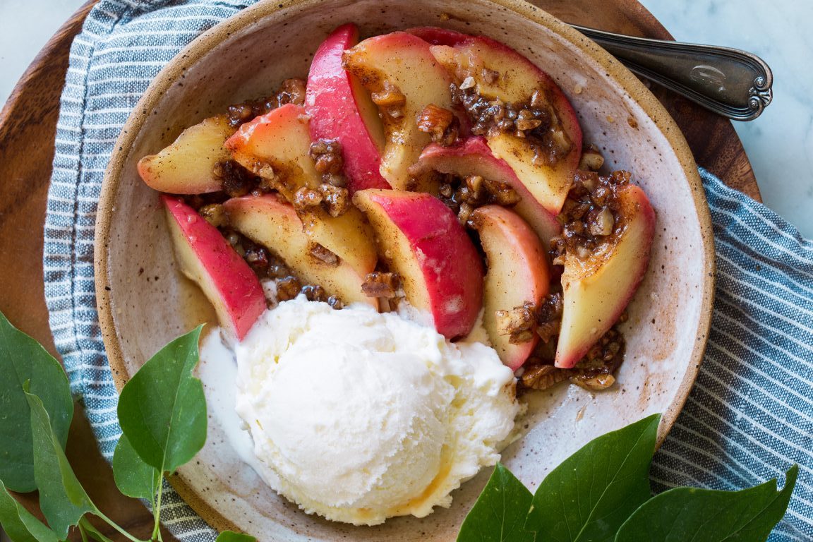 Σερβίρετε ζεστό. Εάν είναι επιθυμητό κόβουμε τα μήλα στην μέση ή σε φέτες και προαιρετικά σερβίρουμε με βανίλια Σαντιγί ή παγωτό .