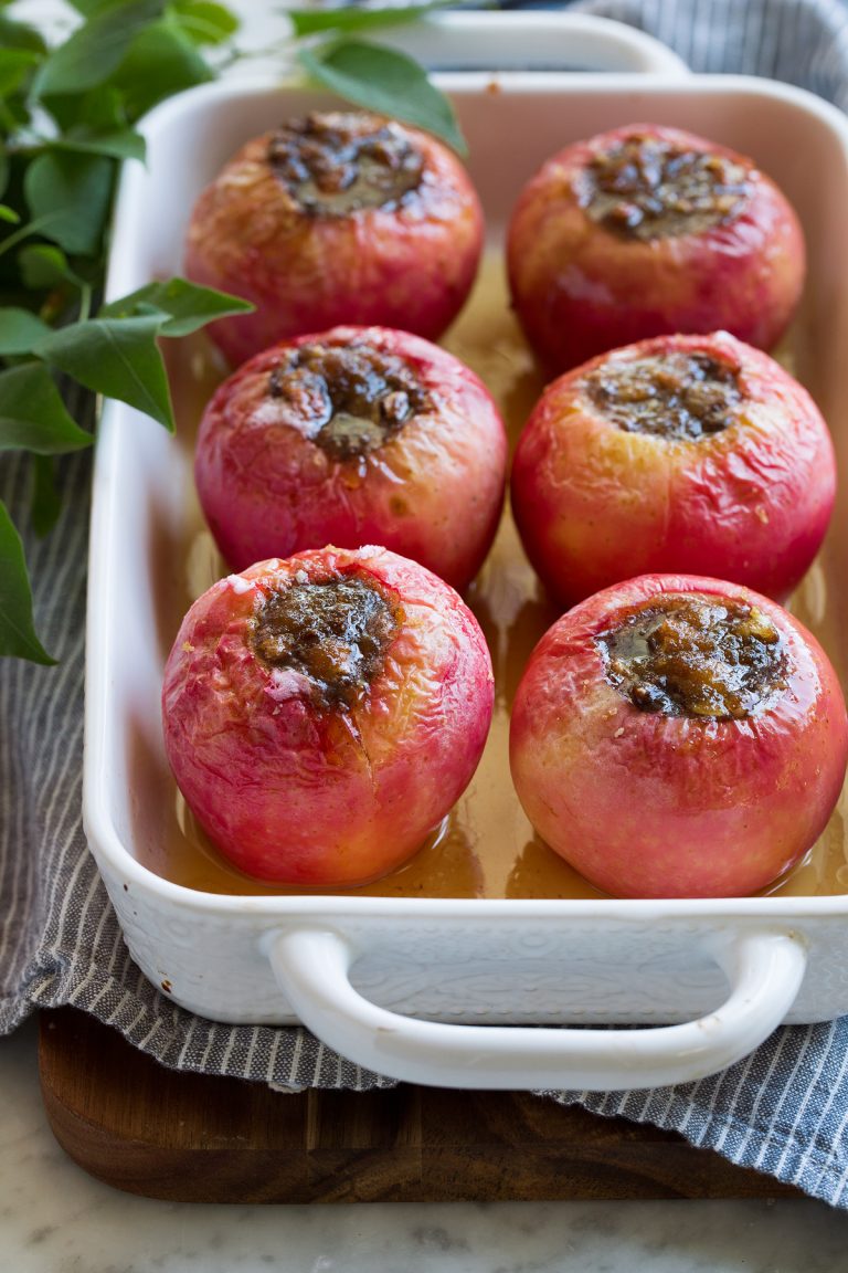 Ρίξτε χυμό μήλου στο κάτω μέρος του ταψιού. Ψήνουμε (ακάλυπτα) σε προθερμασμένο φούρνο μέχρι τα μήλα να είναι τρυφερά, περίπου 35 – 45 λεπτά.
