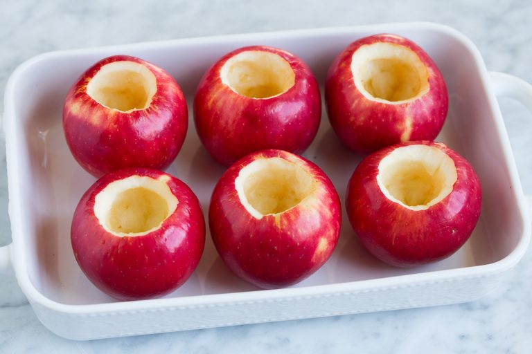 Κόβετε το κοτσάνι από το μήλο και τον σπόρο από το μήλο χρησιμοποιώντας ένα κουταλάκι του γλυκού, ενώ παράλληλα δημιουργείτε χώρο περίπου 2,5 εκ πλάτος και προσέχοντας να μην κόβετε μέχρι το κάτω μέρος του μήλου για η γέμιση θα διαρρεύσει.
