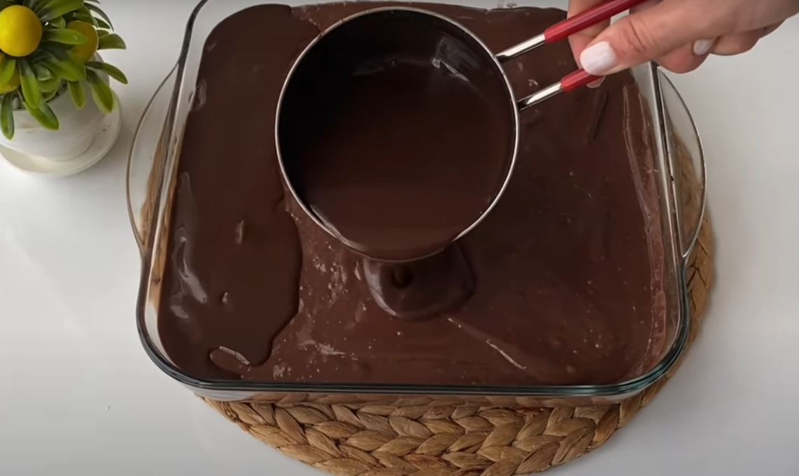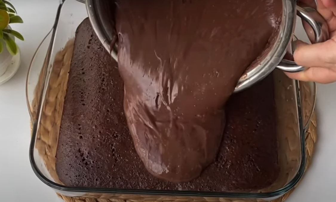 Αφού κρυώσει λίγο το κέικ, ας το τρυπίσουμε παντού με ένα πιρούνι, και ανακατευουμε 1 κουπα γάλα με το κακάο και το ρίχνουμε στο κέικ μας.