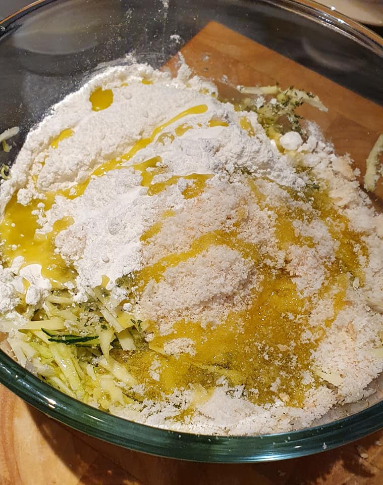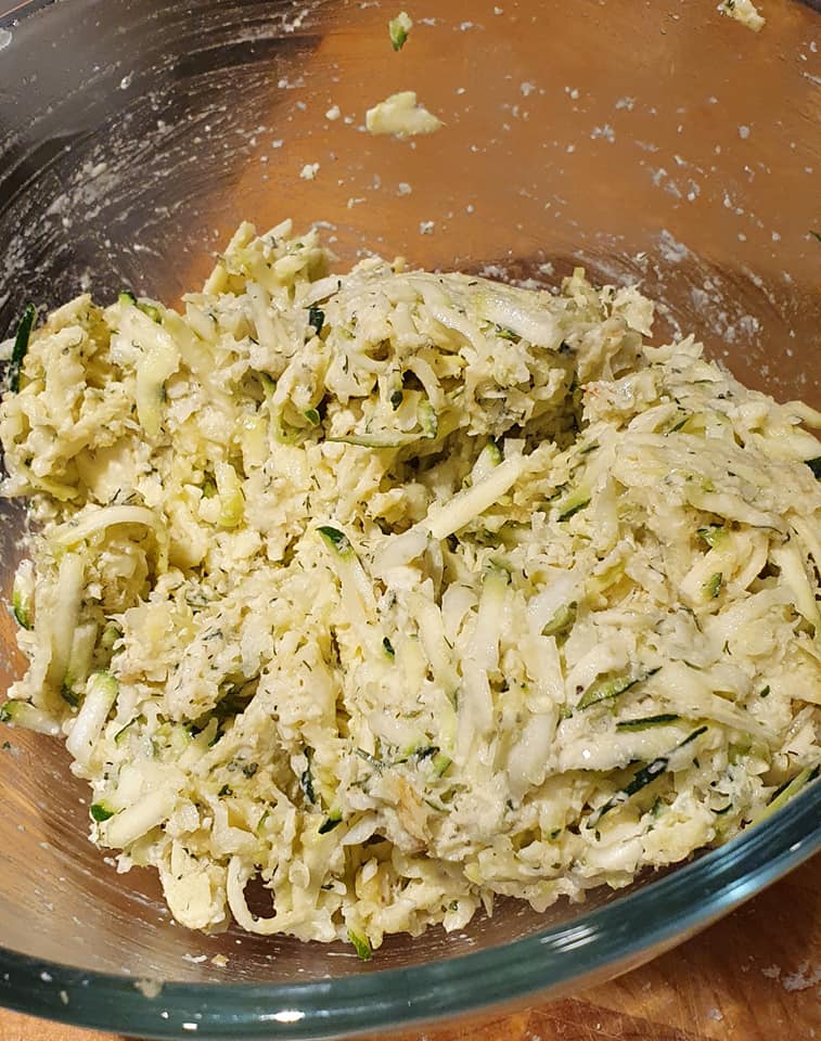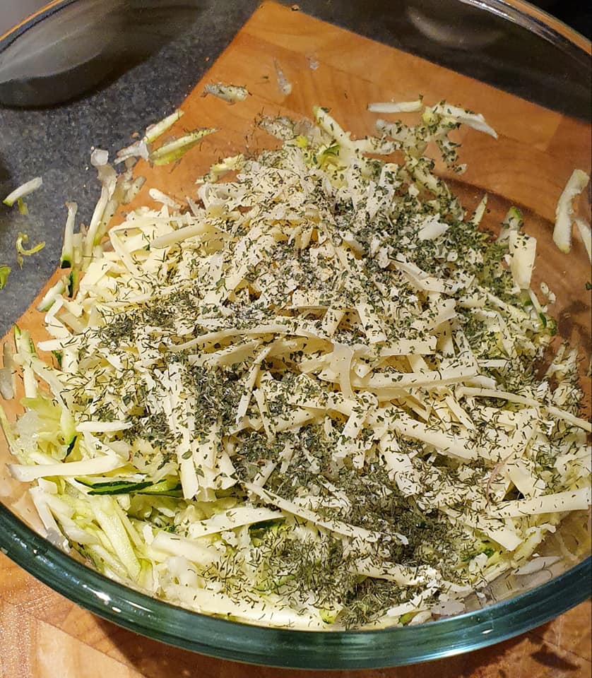 1. Χοντροκομμένα δύο μεσαία κολοκυθάκια (γύρω στα 300 γρ) και ένα μικρό κρεμμύδι σε ένα μπολ. Προσπαθήστε να τα στείψετε όσο το δυνατόν περισσότερο να φύγει η υγρασία για να αποφύγετε το μείγμα να γίνει πολύ ρευστό.