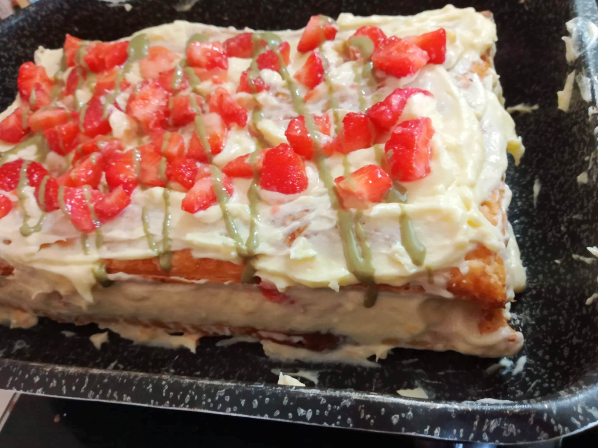 Απλώνουμε ομοιόμορφα την υπόλοιπη κρέμα πασπαλιζουμε κρέμα φυστίκι και απλώνουμε τις υπόλοιπες φραουλες