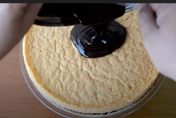 Αδειάζουμε το μισό μείγμα σοκολάτας πάνω από την στρώση μαρμελάδας. Από πάνω βάζουμε την λευκή βάση μπισκότου και ρίχνουμε την υπόλοιπη μαύρη σοκολάτα