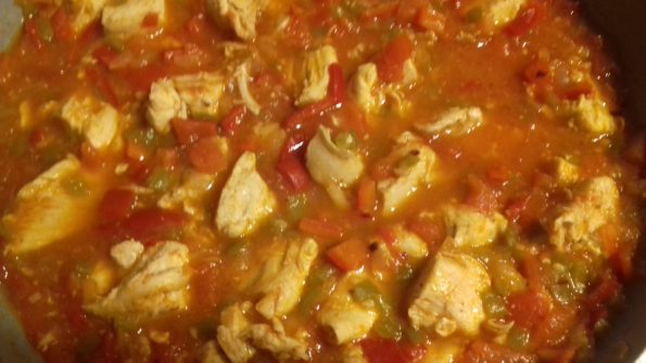 Στη συνέχεια, προσθέστε τις ψιλοκομμένες πιπεριές και τις ντομάτες. Καλύψτε με το καπάκι και συνεχίστε το μαγείρεμα έως ότου μαλακώσει το κοτόπουλο.