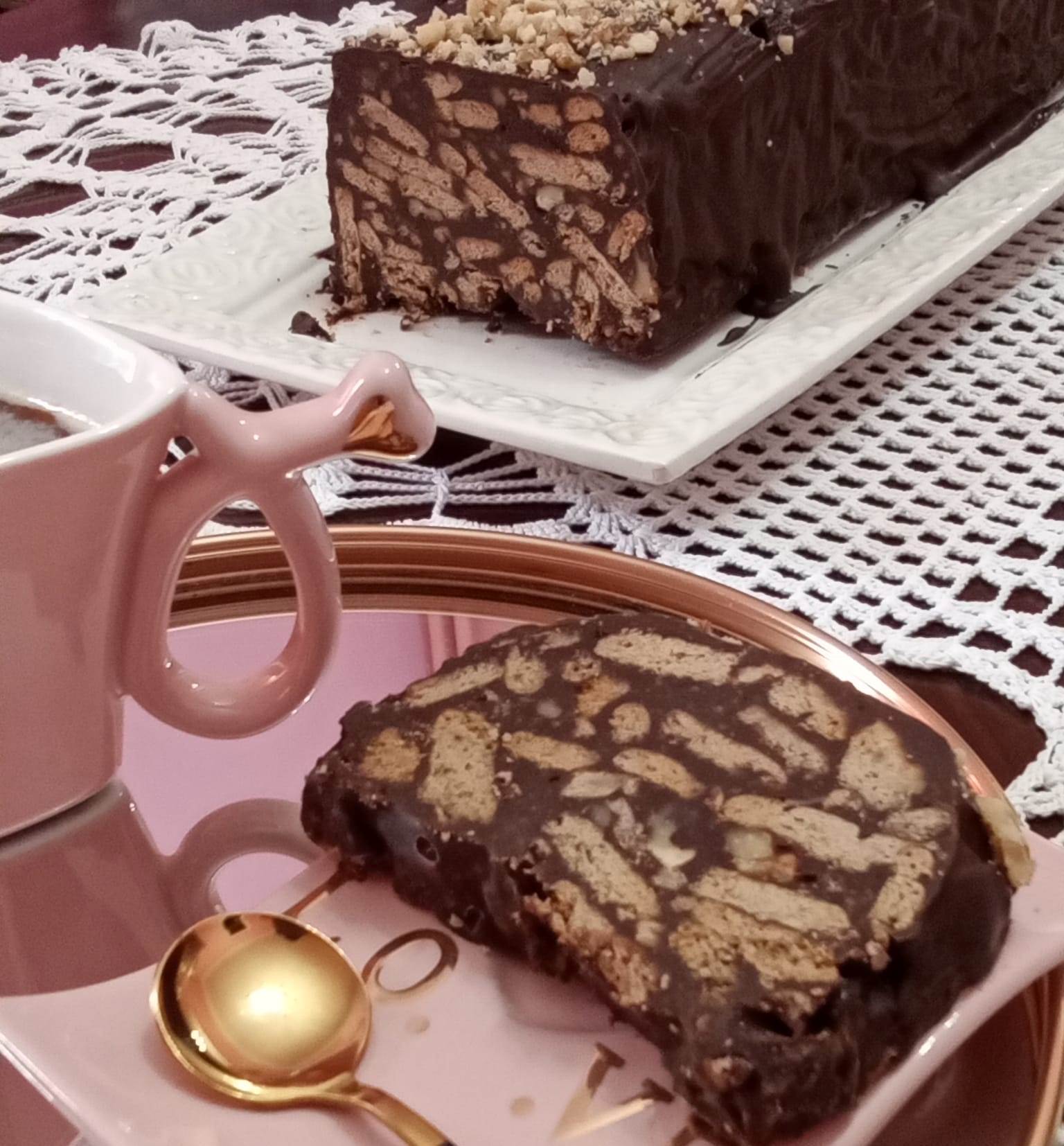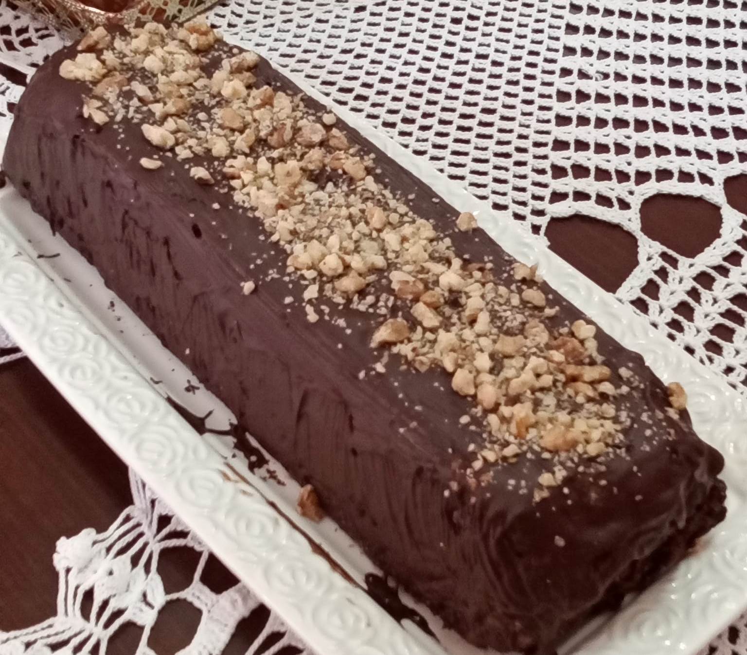 Ριχνουμε το μιγμα και το παταμε καλα. Βαζουμε στο ψυγειο για μια μερα . Ξεφορμαρουμε και το περιχυνουμε με λιωμενη κουβερτουρα και γαρνιρουμε με καρυδια