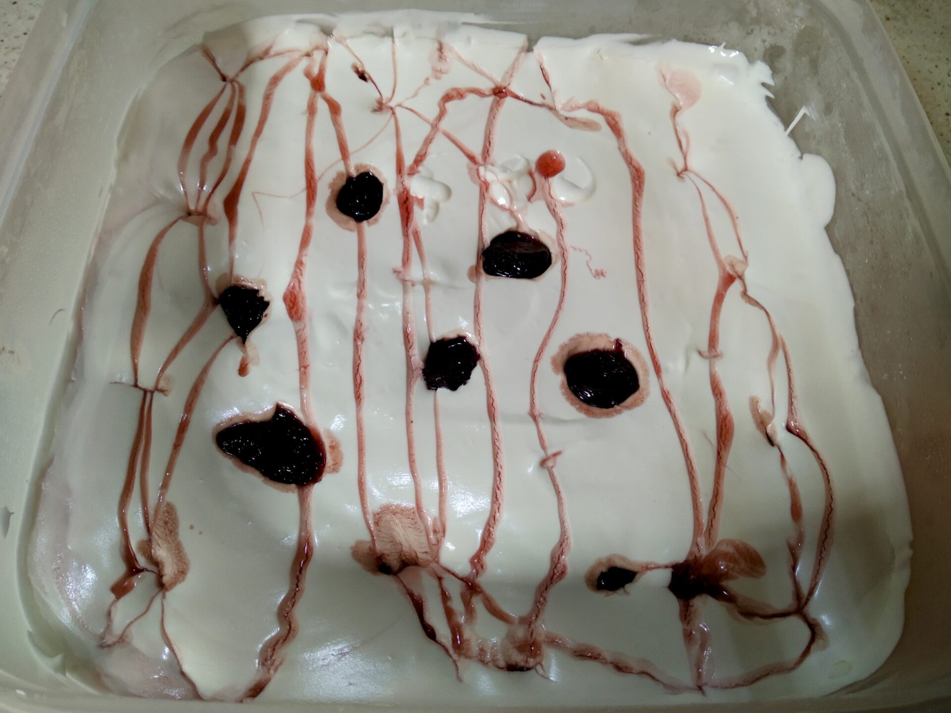 (Να είναι παγωμένα) χτυπάμε για άλλα 3 λεπτά και ρίχνουμε το μέλι και την μαστίχα που έχουμε λιώσει σε Μπεν μαρί.Τοποθετούμε σε μπολ με στρώσεις σιρόπι βύσσινο και γλυκό βύσσινο αν θέλουμε και το βάζουμε στην κατάψυξη.!!!