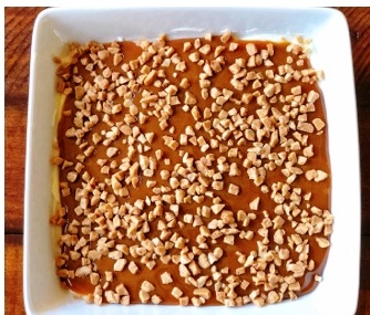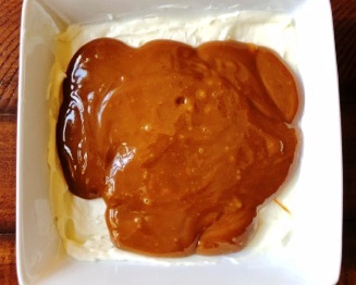 Ρίξτε τη καραμέλα στο πάνω μέρος του μείγματος cheesecake και απλώστε την ομοιόμορφα με μια μικρή σπάτουλα (να αφήσετε να φτάσει στη θερμοκρασία δωματίου πρώτα).