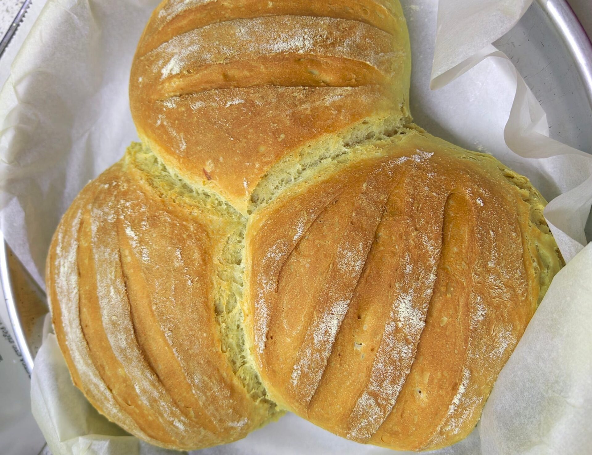 Την ζυμώνουμε άλλα 1-2 λεπτά και την χωρίζουμε στα δύο. Πλάθουμε με τα χέρια μας δύο φραντζόλες και τις τοποθετούμε σε ταψί φούρνου που έχουμε καλύψει με λαδόκολλα