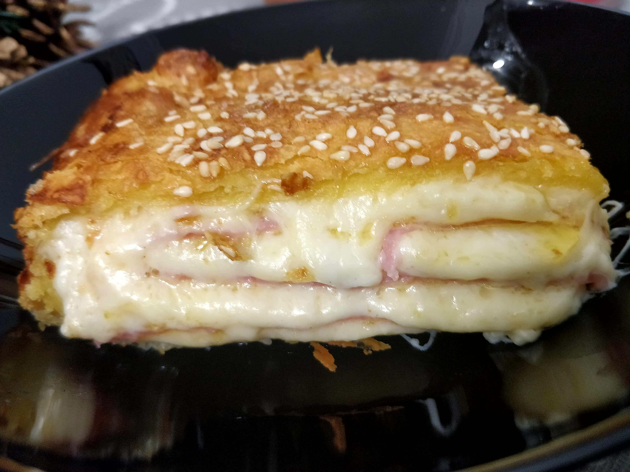 ρίχνουμε από πάνω τα τυριά και μετά από πάνω το ζαμπόν και ξανακάνουμε πάλι την