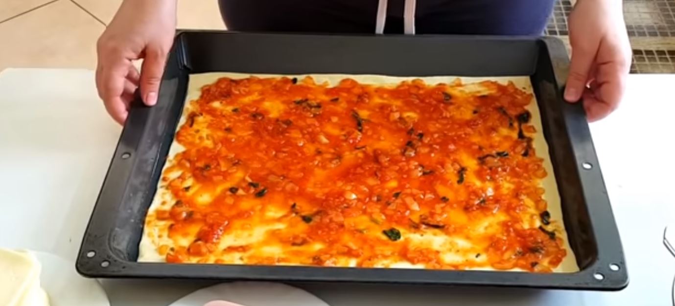 Από πάνω ρίχνουμε την σάλτσα ντομάτας και την απλώνουμε να πάει παντού.