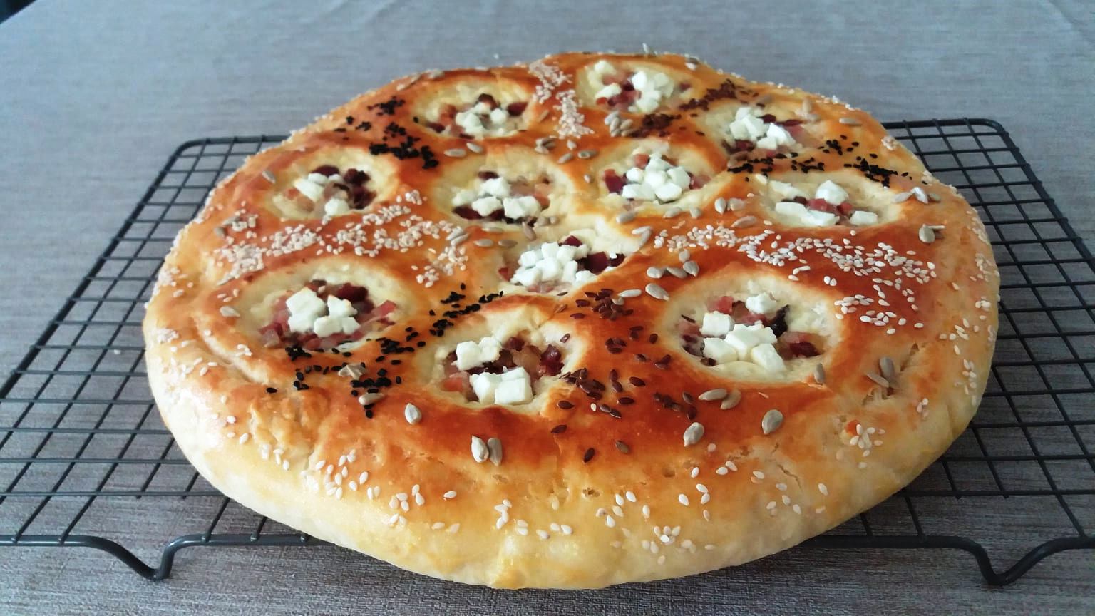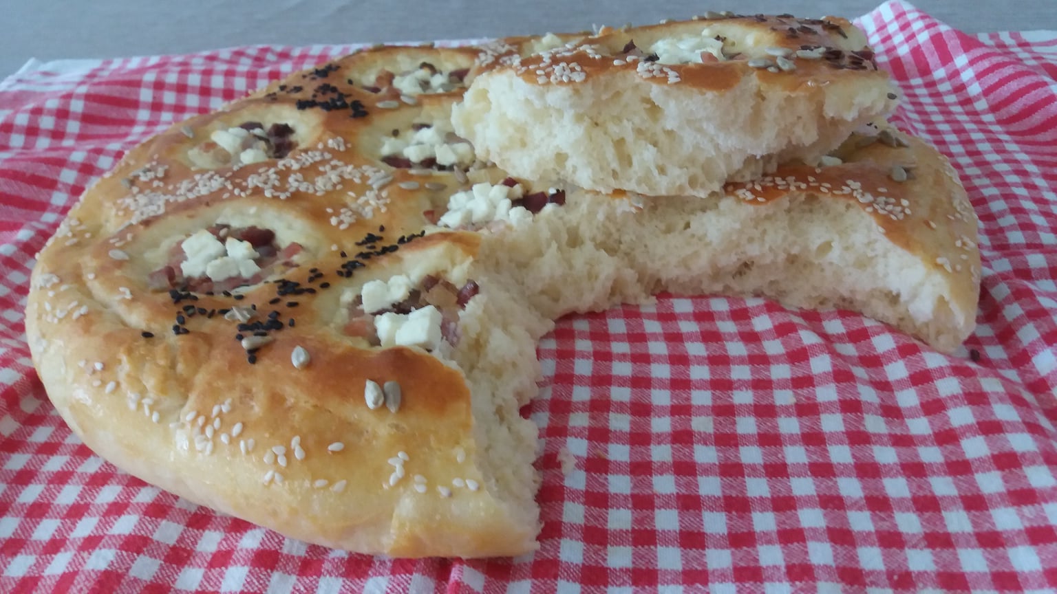 Μοιράζω ομοιόμορφα το μείγμα τυριού και αυγών στις εσοχές. Στη συνέχεια, απλώνω το ψιλοκομμένο μπέικον/ζαμπόν και τέλος, το ψιλοκομμένο τυρί φέτα. Αυτό δίνει την πλούσια γεύση στο **Αφράτο Ζαμπονοτυρόψωμο**.