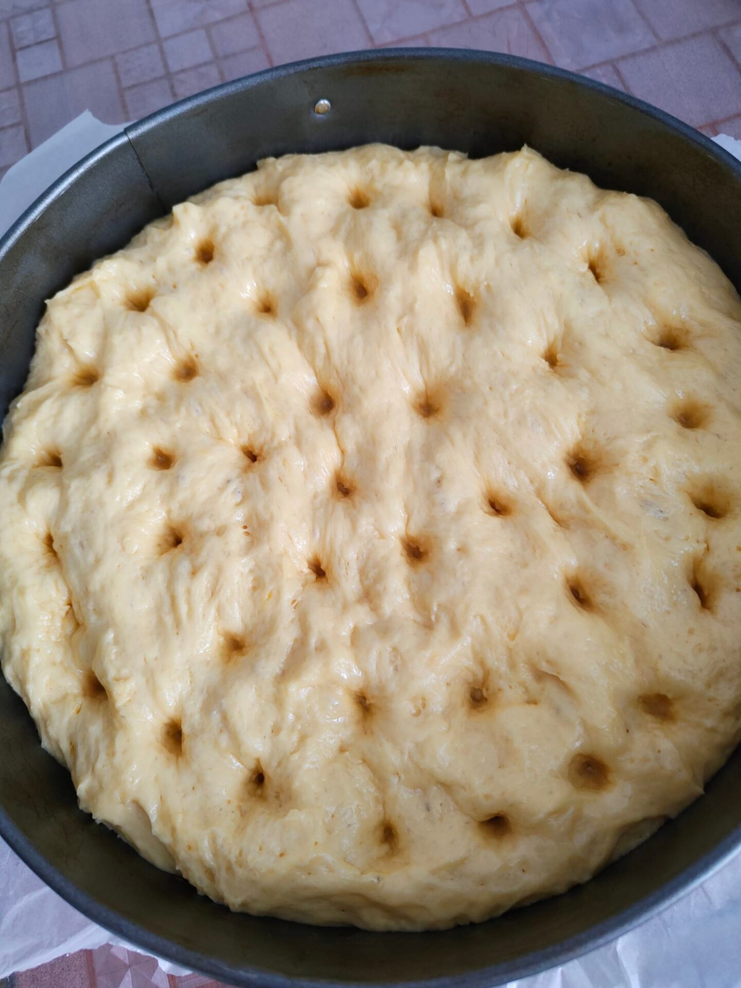 Κάνουμε προσεκτικά τρύπες στη ζύμη, έτσι ώστε το βούτυρο και η ζάχαρη να μουλιάσουν καλά ολόκληρο το κέικ με τη γεύση και το άρωμά του.