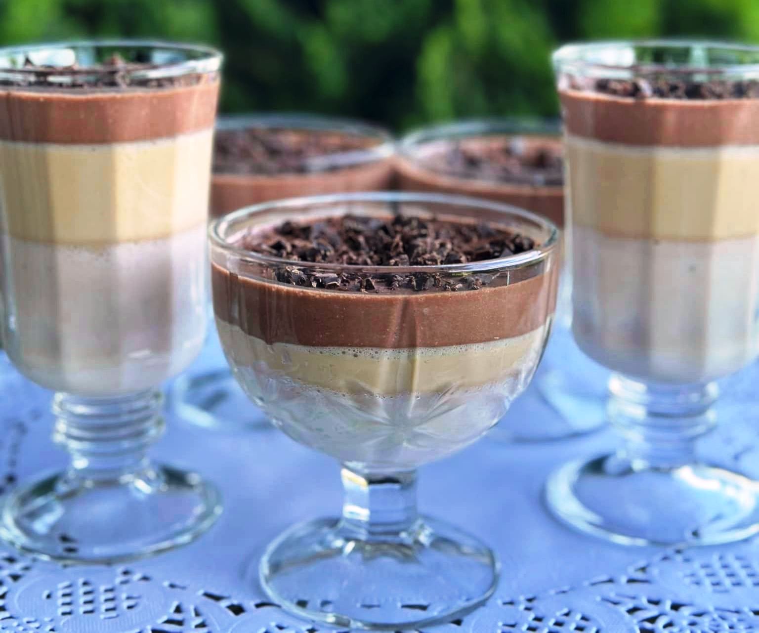 προσθέτουμε κακάο αραιωμένο με γάλα και 10 γρ. διαλυμένη ζελατίνη. Χτυπάμε με μπλέντερ σε χαμηλές στροφές και ρίχνουμε τρίτη στρώση.