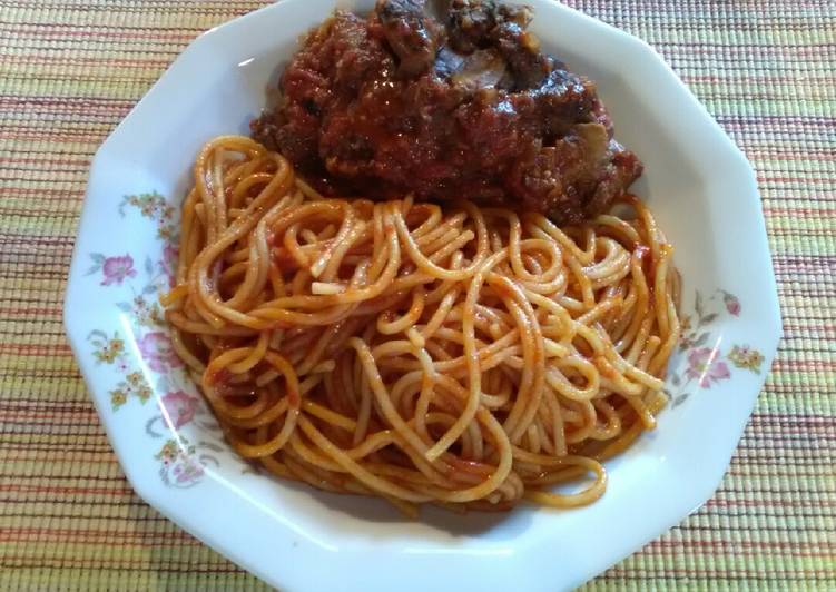 Σωτάρουμε καλά μέχρι να ροδίσει το κρέας. Προσθέτουμε τα μπαχαρικά και το αλατοπίπερο. Όταν σωταριστεί προσθέτουμε την ντομάτα τριμμένη στο χοντρό του τρίφτη και τον πελτέ ή αρκετή συμπυκνωμένη ντομάτα. Προσθέτουμε αρκετό νερό και κλείνουμε τη χύτρα. Βράζουμε για μισή ώρα από το σφύριγμα της βαλβίδας σε χαμηλή φωτιά. Ανοίγουμε την χύτρα αφού πέσει η βαλβίδα και δοκιμάζουμε το κρέας. Αν χρειαστεί βράζουμε για δέκα λεπτά ακόμη με κλειστή τη χύτρα, προσθέτοντας λίγο νεράκι αν χρειάζεται.