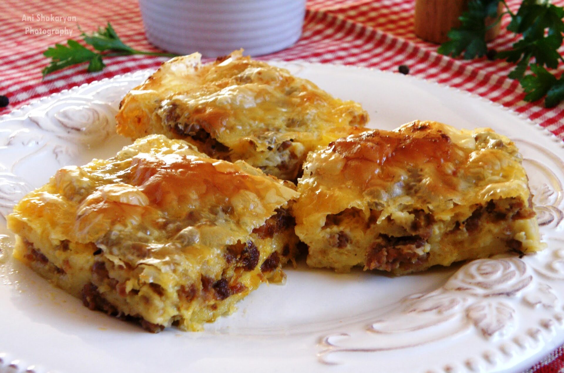 Καλύψτε ξανά με τρια φύλλα βουτυρο και πασπαλίστε ομοιόμορφα με κιμά. Με τον ίδιο τρόπο, εναλλάξτε φύλλα και κιμά μέχρι να εξαντληθούν. Κόψτε την πίτα σε κομμάτια με ένα μαχαίρι και ρίξτε λάδι, προσπαθώντας να μπει στις αυλακώσεις που κόβετε.
