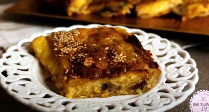 5) Σε ένα πυρέξ η γενικα οτι ταψί θέλουμε, ανοίγουμε το ενα απο τα δυο φύλλα σφολιάτας αφότου έχουμε αληψει με λίγο λάδι. Προσθέτουμε την γεμιση, έπειτα καλύπτουμε με τα τυριά και βάζουμε από πάνω και το δεύτερο φύλλο.