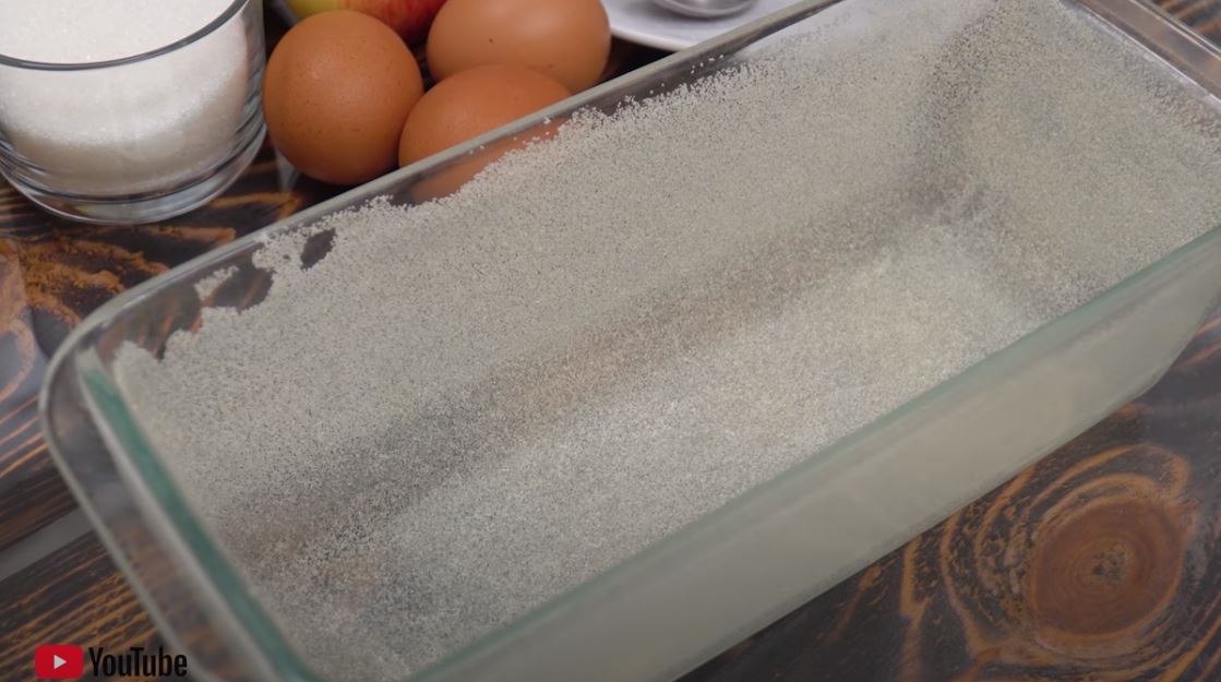Βουτυρώνουμε και ζαχαρώνουμε μία φόρμα του κέικ 23χ11 εκ ή 22 εκ