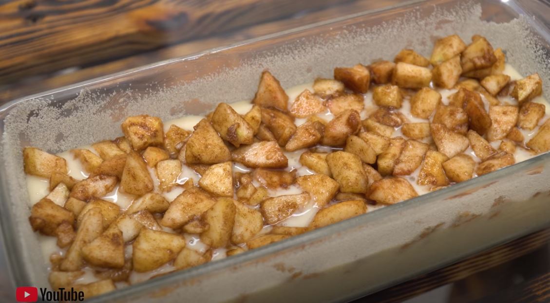 Ρίχνουμε το μείγμα του κέικ μέσα στην ζαχαρωμένη φόρμα και βάζουμε και τα μήλα από πάνω.