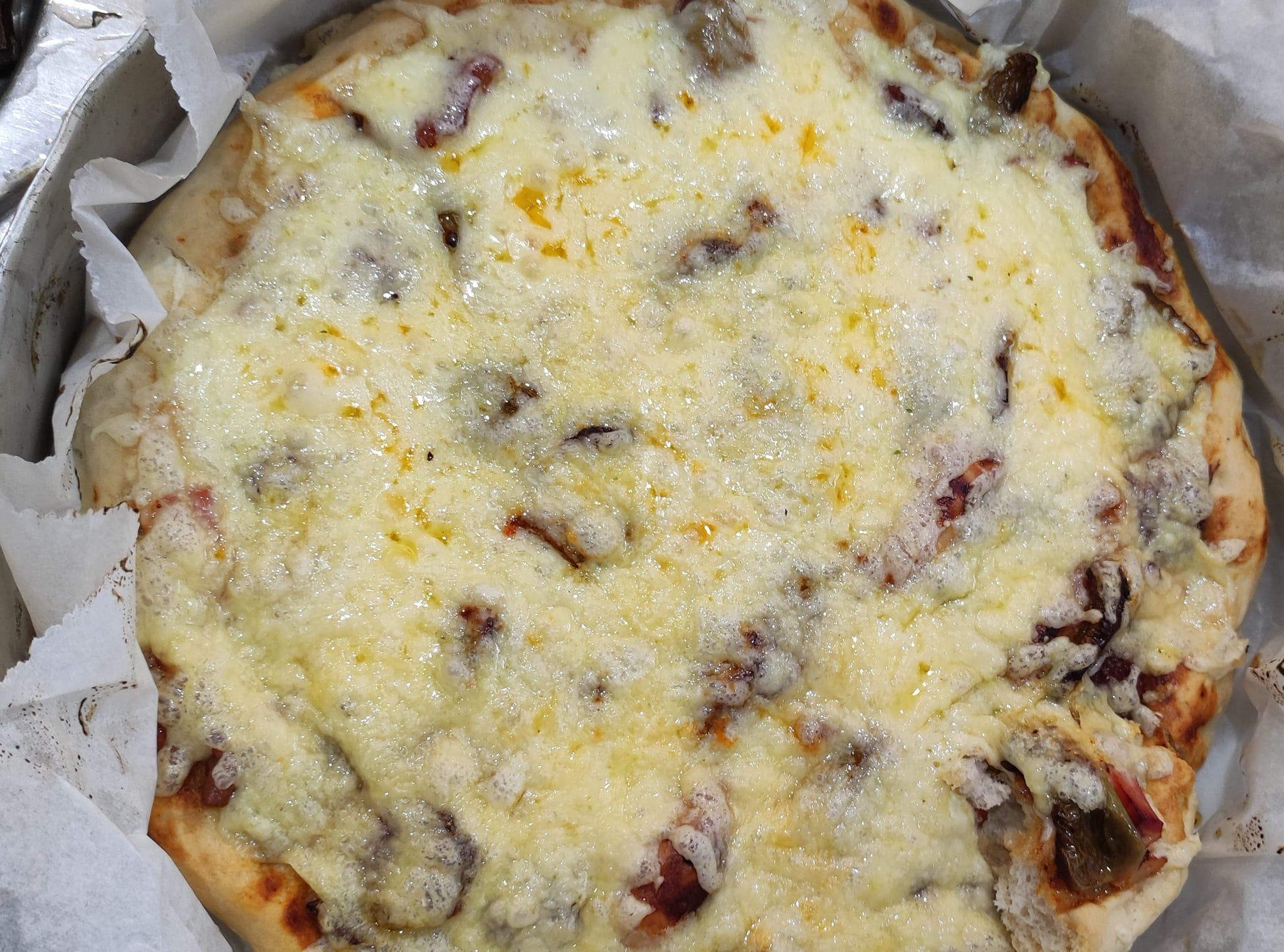 Πλάθουμε το ζυμάρι σε πίτσα και βάζουμε την ανάλογη γέμιση από πάνω