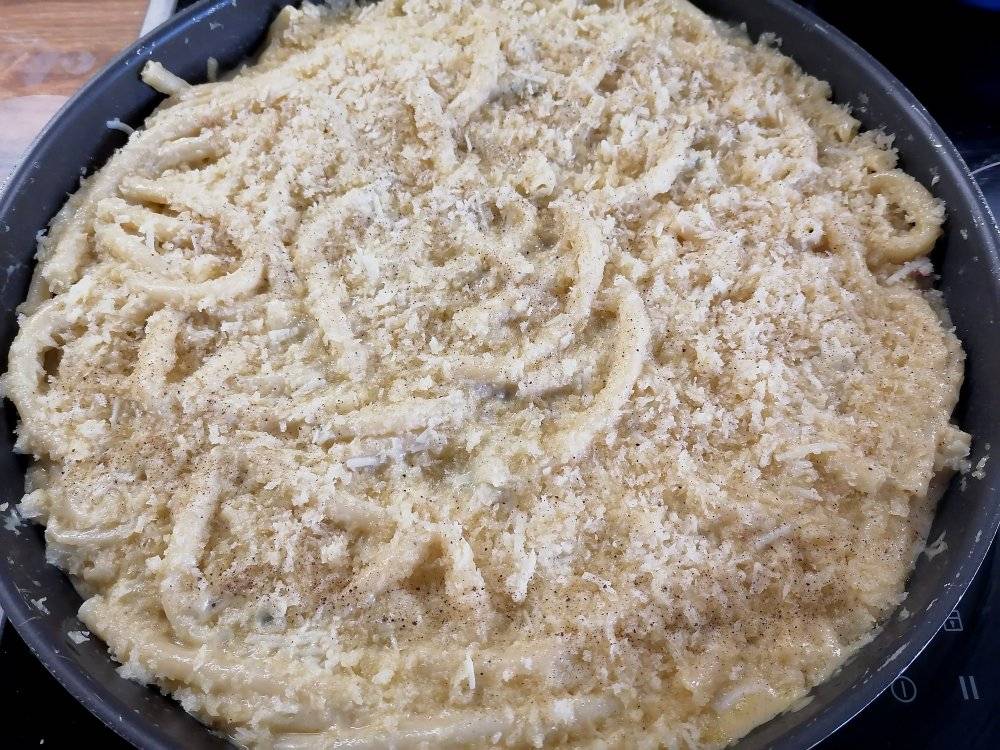 Για την επικάλυψη, στρώνουμε πάνω από τα ζυμαρικά τριμμένο κεφαλοτύρι, ανακατεμένο με τριμμένη ψίχα φρέσκου ψωμιού και λιωμένο βούτυρο.