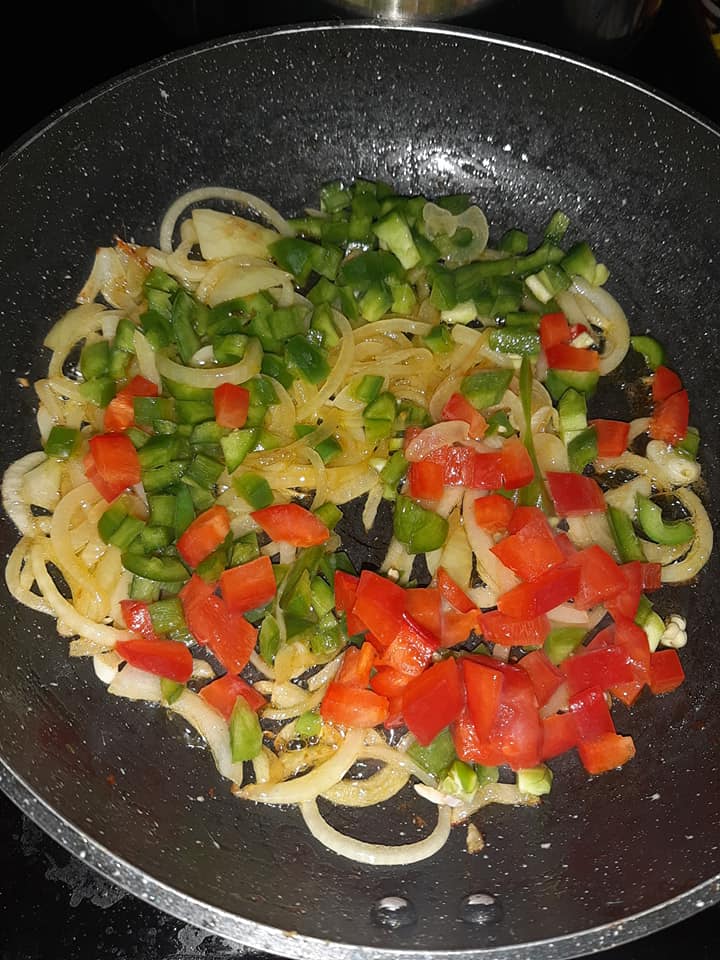 Τηγανίζουμε τα κρεμμύδια σας με βούτυρο, προσθέτουμε το σκόρδο και τις πιπεριές