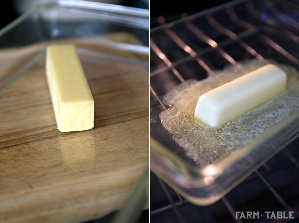 Βάλτε το βούτυρο σε ένα ταψί(πυρεξ) 20χ30 εκ και αφήστε το να λιώσει στον φούρνο καθώς είναι σε προθέρμανση