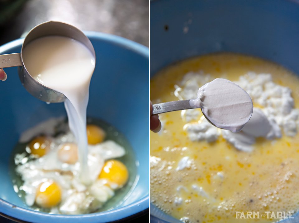 Εν τω μεταξύ, ανακατέψτε τα αυγά, το γάλα, το τυρί cottage, και την ξινή κρέμα
