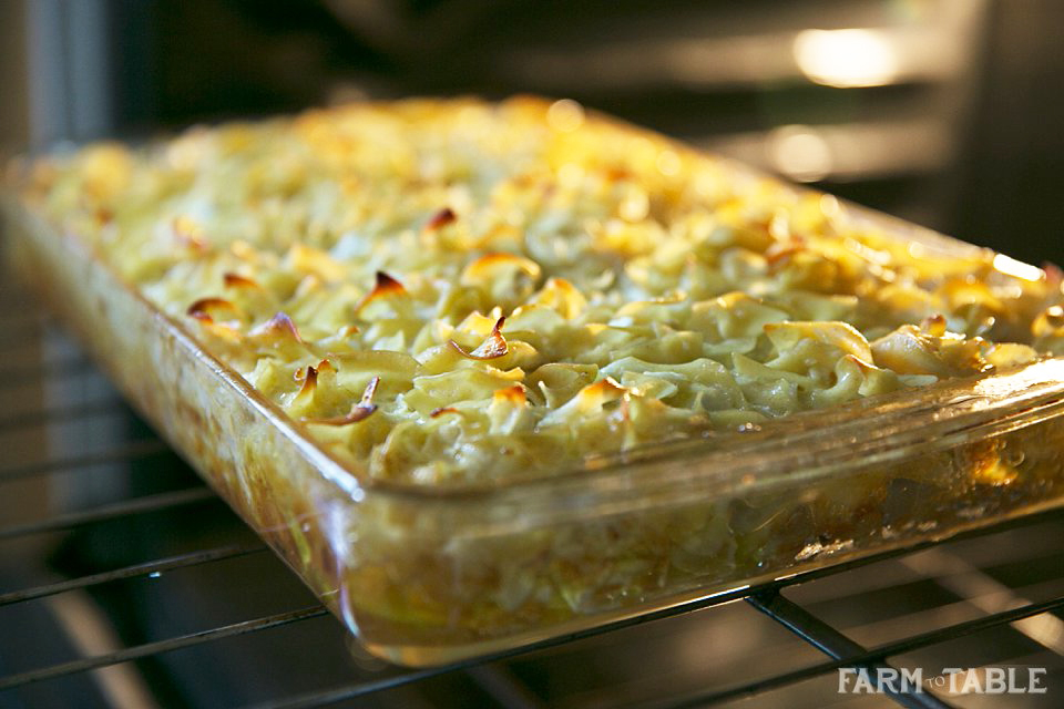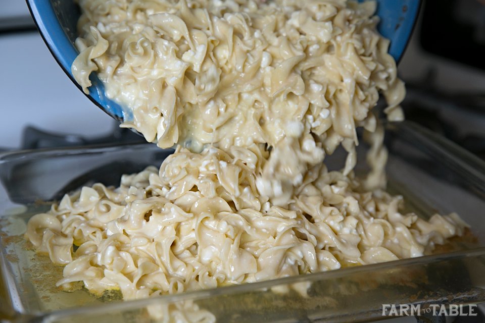 Ρίξτε το μείγμα ζυμαρικών πάνω από το λιωμένο βούτυρο