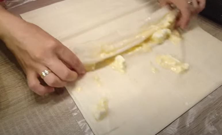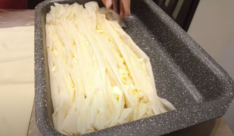 Με τρυπητή κουτάλα, πασπαλίζουμε λιγό από το μείγμα σε κάθε φύλλο , το οποίο τοποθετούμε με την μακρια πλευρά.