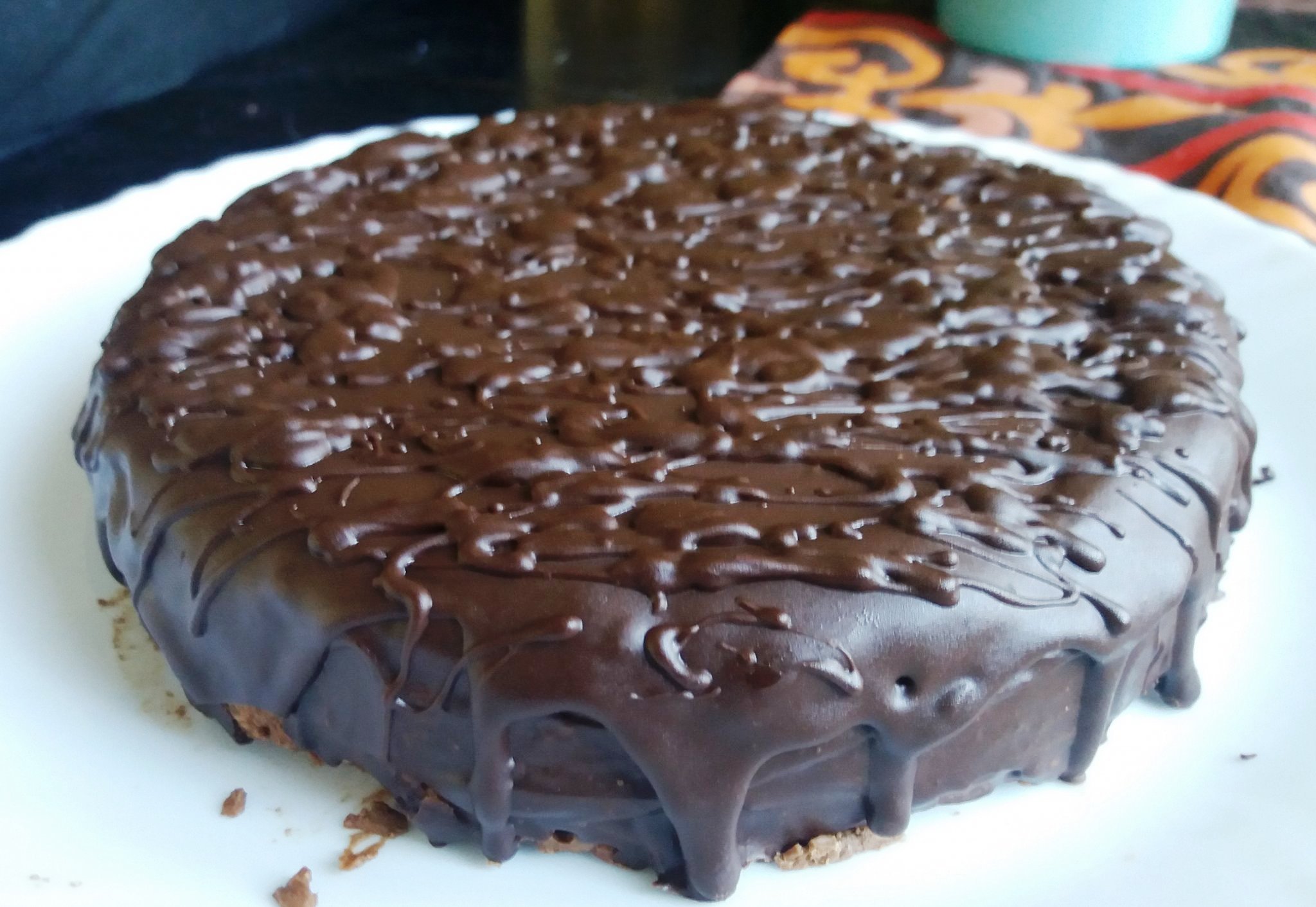 Ρίχνετε τη λιωμένη σοκολάτα πάνω από το κέικ, την απλώνετε ομοιόμορφα και στη συνέχεια τη λειαίνετε με ένα μαχαίρι ή μια σπάτουλα. Αφήστε το κέικ σε θερμοκρασία δωματίου να σταθεροποιηθεί η επικάλυψη.
