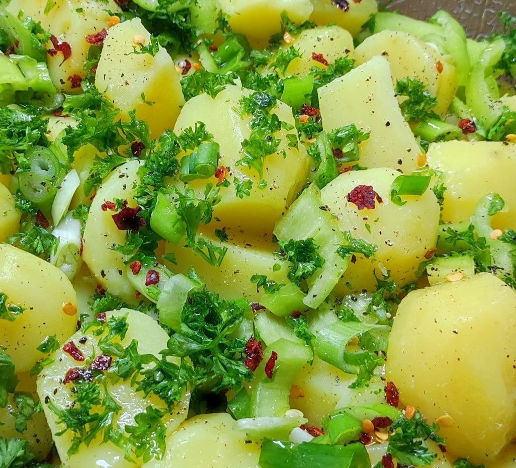Δοκιμάστε την πιο νόστιμη και εύκολη Πατατοσαλάτα της Μαρίας! Φτιάχνεται με άνηθο, φρέσκα κρεμμυδάκια, πράσινη πιπεριά και μυστικό το τσιμένι για μοναδική γεύση. Ιδανική νηστίσιμη και vegan επιλογή.