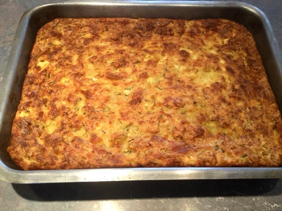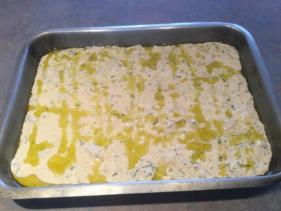 Σε ένα μεγάλο μπολ βάλτε όλα τα συστατικά και ανακατέψτε καλά, στη συνέχεια πάρτε μεμονωμένα φύλλα και κόψτε τα σε μικρά κομμάτια ανακατέψτε καλά αφήστε το να σταθεί για 10 λεπτά και στη συνέχεια ρίξτε το σε ένα δίσκο 40 x 30 cm που έχει λαδωθεί ψιλοβρέξτε με περισσότερο ελαιόλαδο στην κορυφή και αφήστε το να ηρεμήσει 15 λεπτά