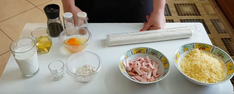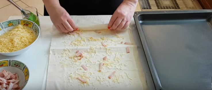 Ραντίζουμε με λίγο λάδι απλώνουμε λίγο τυρί και και μερικά κομματάκια καπνιστής μπριζόλας και αρχίζουμε απο την στενότερη πλευρά να το κάνουμε το φύλλο πιετες ή πλισέ.