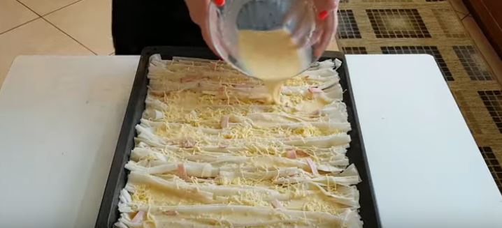 Μόλις μαζέψουμε το ένα φύλλο το τοποθετώ μέσα στο ταψί, και ξεκινάω το ίδιο και στα υπόλοιπα. Στο τέλος ότι υλικό μας έχει μείνει από τυράκι και καπνιστή μπριζόλα το πασπαλίζουμε από πάνω