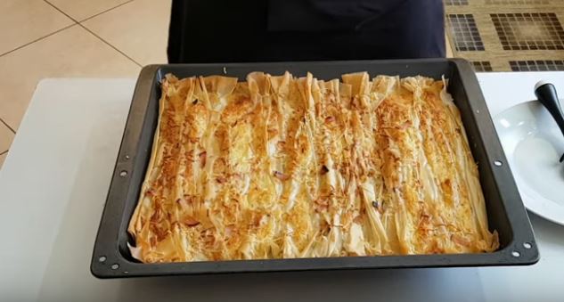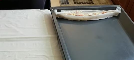 Ανοίγουμε τα φύλλα πάνω στον πάγκο μας από την μακρόστενη πλευρά καθώς βάζουμε δίπλα και το ταψί από την μακρόστενη πλευρά.