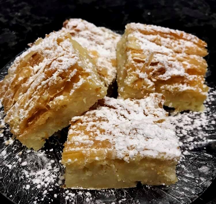 Πίτα με τραγανό ζαρωμένο φύλλο πασπαλισμένη με ζάχαρη άχνη.