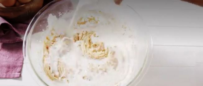 Προσθέτω το μισό από το μείγμα του 1ου Μπολ (τα στερεά) στο 2ο Μπολ (τα υγρά) και χτυπάω μέχρι να αναμειχθούν καλά. Ρίχνω το γάλα και ανακατεύω μέχρι να ομογενοποιηθούν όλα πλήρως. Προσθέτω και το υπόλοιπο από το 1ο Μπολ και ανακατεύω μέχρι να γίνει μία λεία κρέμα.