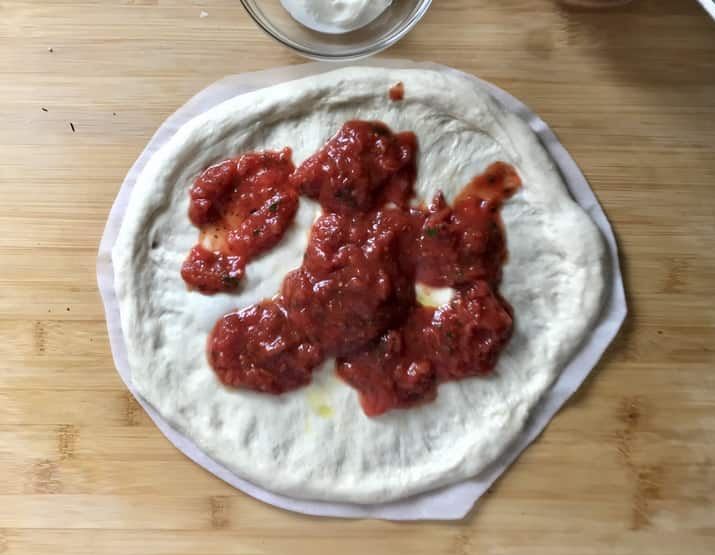 Απλώστε περίπου ¾-1 φλιτζάνι σάλτσα πίτσας πάνω στην επιφάνεια της πίτσας.