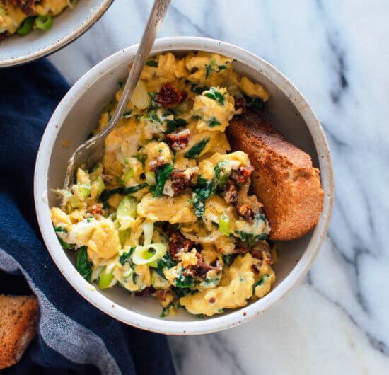 Ρίξτε τα αυγά στο τηγάνι και μειώστε τη θερμότητα σε μέτρια χαμηλή. Χρησιμοποιήστε τη σπάτουλα σας για να ανακατέψετε απαλά τα αυγά να ψηθούν αλλά να είναι λίγο υγρά, περίπου 3 με 5 λεπτά.