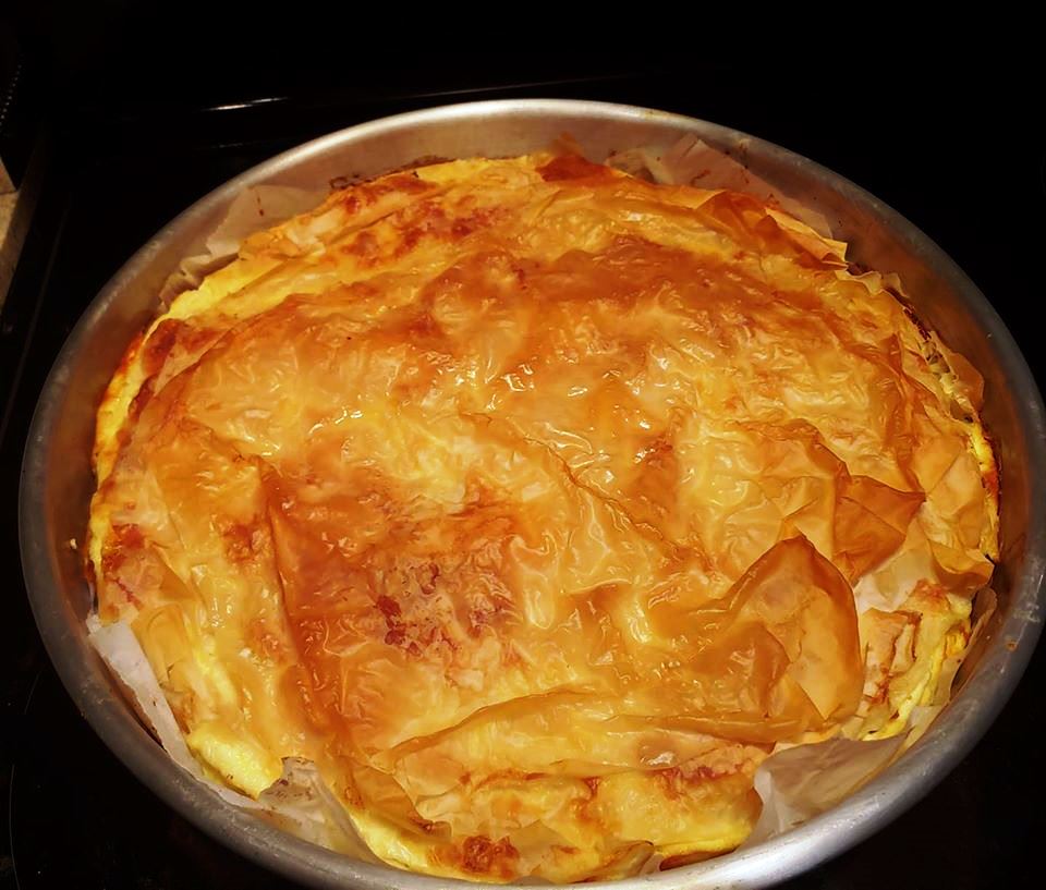 Σ᾿ ένα βουτυρωμένο, τετράγωνο, πυρίμαχο σκεύος, ή ταψί νούμερο 32 για πίτα, απλώνουμε δύο φύλλα και τα βουτυρώνουμε.