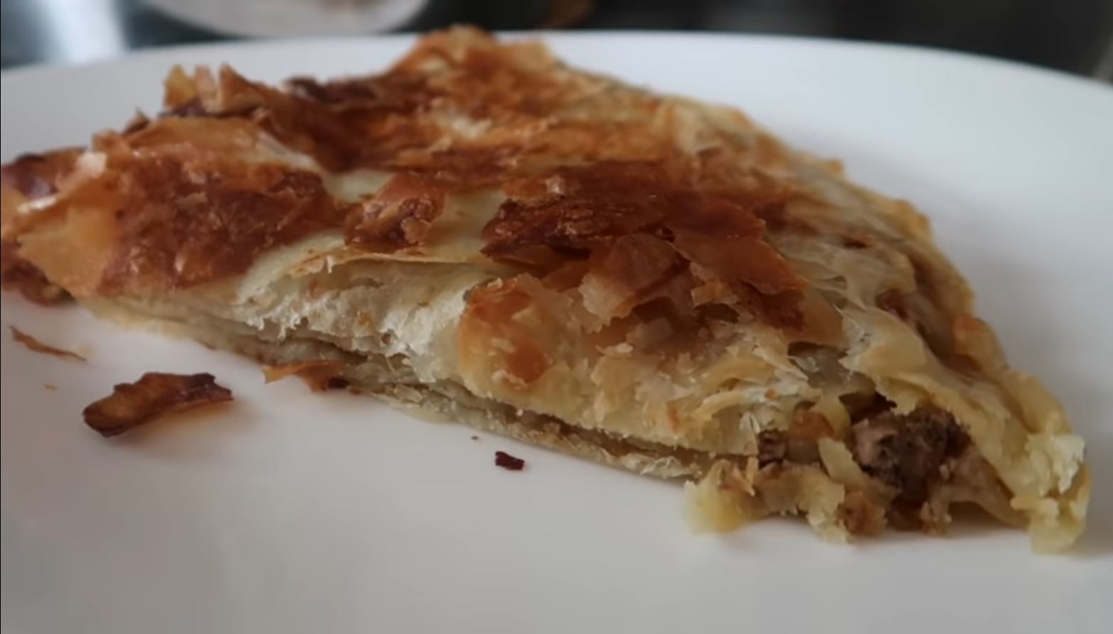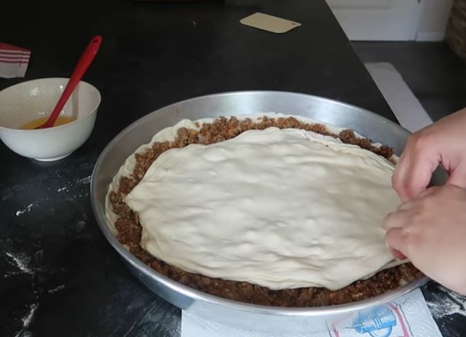 Ρίχνουμε την γέμιση μέσα στο ταψί την απλώνουμε και από πάνω ρίχνουμε το άλλο φύλλο