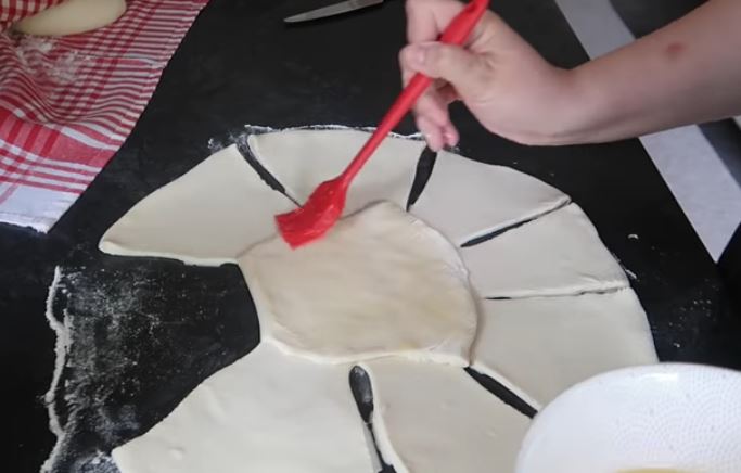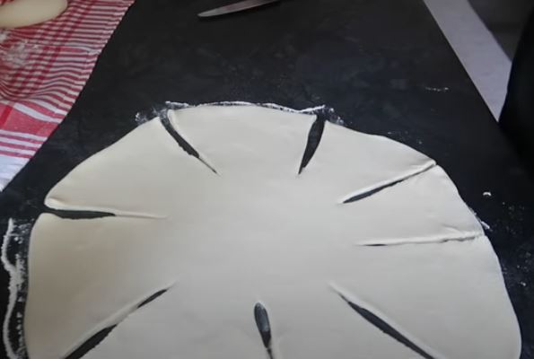 το πρώτο μισό της ζύμης. Ανοίγουμε το πρωτο φύλλο το χαράζουμε όπως βλέπετε στην φωτό