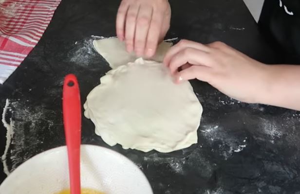 Χωρίζουμε την ζύμη σε 2 κομμάτια και την τυλίγουμε με μία πετσέτα και την αφήνουμε