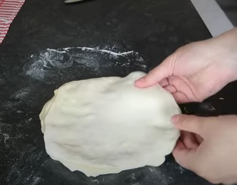 Μόλις τελειώσουν τα ανοίγουμε με τα χέρια ή και το πλαστη στο μέγεθος του ταψιού και το στρώνουμε μέσα στο ταψί.