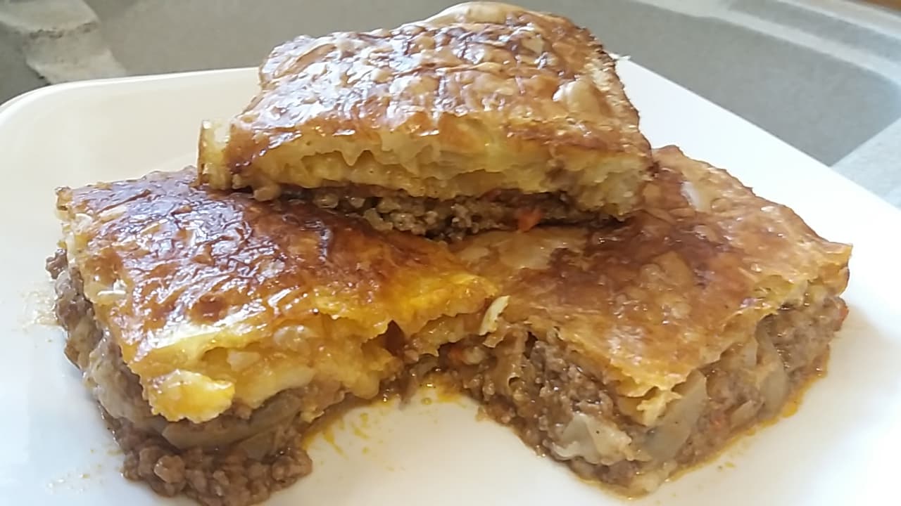 Σε μία κατσαρόλα βάζουμε το λάδι… μόλις ζεσταθεί προσθέτουμε το κρεμμύδι το σοτάρουμε καλά βάζουμε και τον κιμά και τα ανακατεύουμε μέχρι να αλλάξει χρώμα ο κιμάς προσθέτουμε την πιπεριά, το αλάτι ,το πιπέρι και τα μανιτάρια. Σβήνουμε με το κρασί. Μαγειρεύουμε για 10 λεπτά. Σβήνουμε τη φωτιά και βάζουμε στο τέλος το τριμμένο τυρί. Ανακατεύουμε καλά. Λαδώνουμε το ταψί μας και τοποθετούμε ένα ένα τα φύλλα του πακέτου λαδώνοντας το καθένα με τη βοήθεια πινέλου με το υπόλοιπο λάδι. Βάζουμε τη γέμιση την απλώνουμε σε όλο το ταψί και σκεπάζουμε με τα υπόλοιπα φύλλα και αυτά λαδωμένα Χαράζουμε την πίτα μας κόβουμε σε κομμάτια.