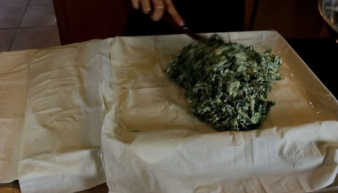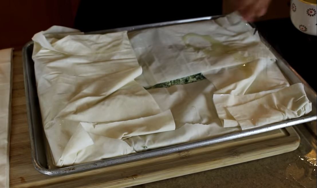 Απλώστε όλη τη γέμιση μέσα στα φύλλα. Όλα τα φύλλα που κρέμονται έξω από το ταψί πρέπει να διπλώσουν πάνω από τη γέμιση.