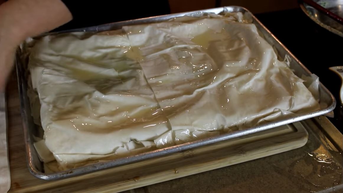 Τοποθετήστε 2 φύλλα μισά στο ταψί και μισά κρέμονται έξω από το ταψί και στις τέσσερις πλευρές του τηγανιού.